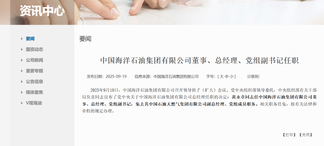 9月19日,中國海洋石油集團(tuán)有限公司(以下簡稱“中海油集團(tuán)”)官網(wǎng)發(fā)布消息稱,在當(dāng)日集團(tuán)舉行的領(lǐng)導(dǎo)班子(擴(kuò)大)會(huì)議上,黃永章被任命為任集團(tuán)董事、總經(jīng)理、黨組副書記,同時(shí)免去其中國石油天然氣集團(tuán)有限公司(以下簡稱“中石油集團(tuán)”)副總經(jīng)理、黨組成員職務(wù)。