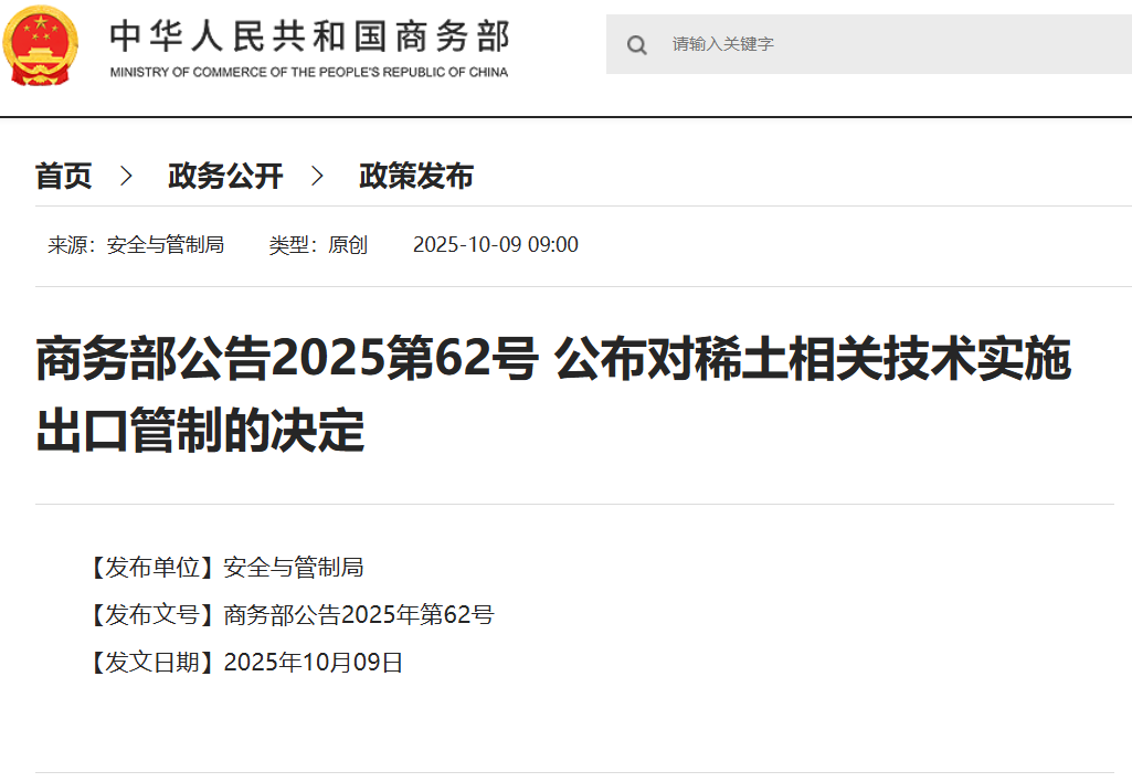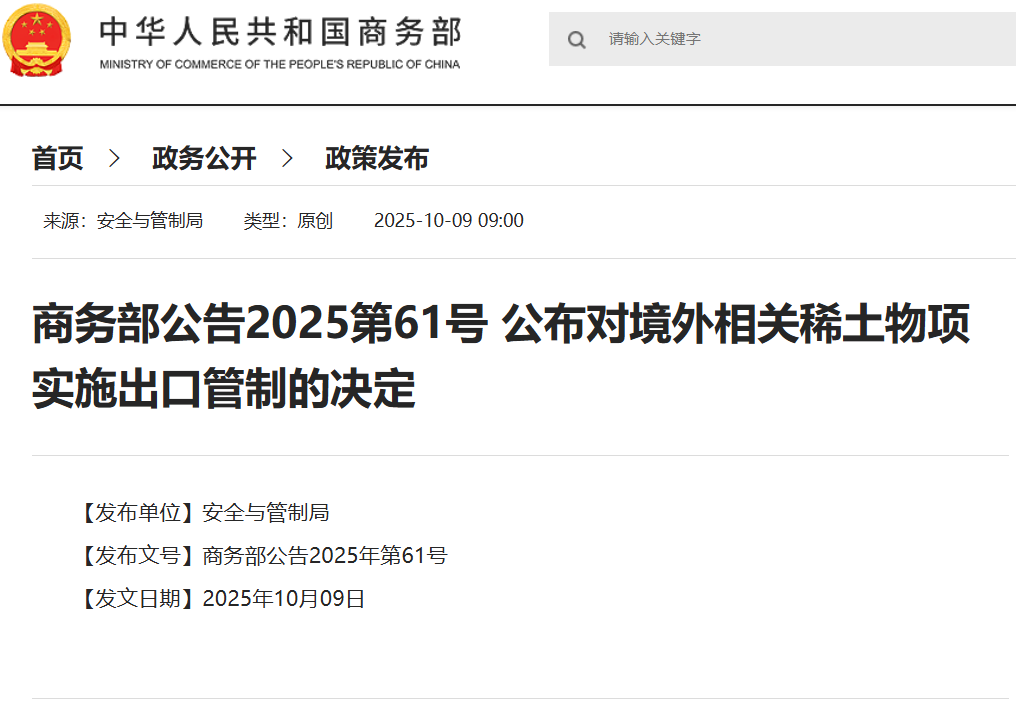 10月9日,商務(wù)部發(fā)布公告,公布對(duì)稀土相關(guān)技術(shù)實(shí)施出口管制的決定、公布對(duì)境外相關(guān)稀土物項(xiàng)實(shí)施出口管制的決定。